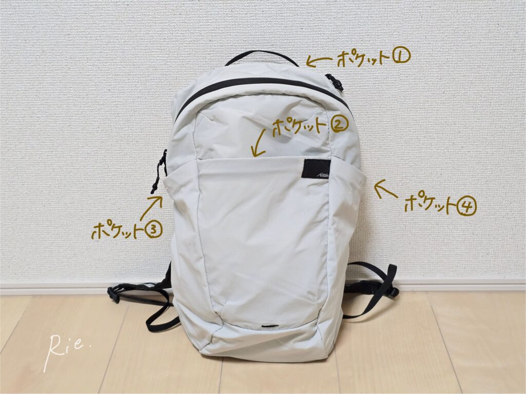 収納スペースはメインスペースの他に、ファスナー付きのポケットが上部に1つ(ポケット①)と前面に1つ(ポケット②)、ファスナーなしのポケットが左右に1つずつ(ポケット③④)あります。
